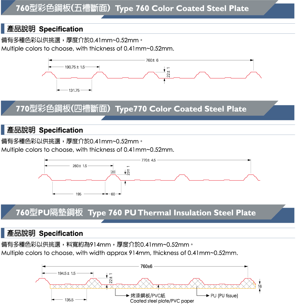 備有多種色彩以供挑選,料寬約為 914 mm,厚度介於 0.41 mm ~ 0.52 mm 。