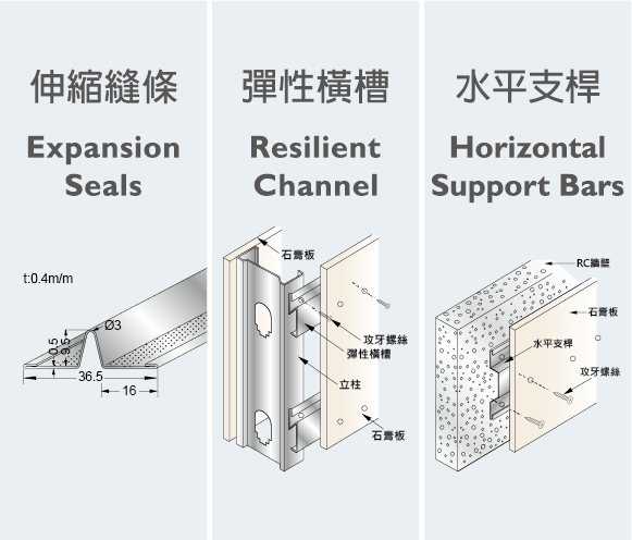 利用鋼板彈性吸收牆面因溫度變化或震動而產生可能的龜裂現象。也可用於屋頂下,與矽酸鈣板結合使用。
